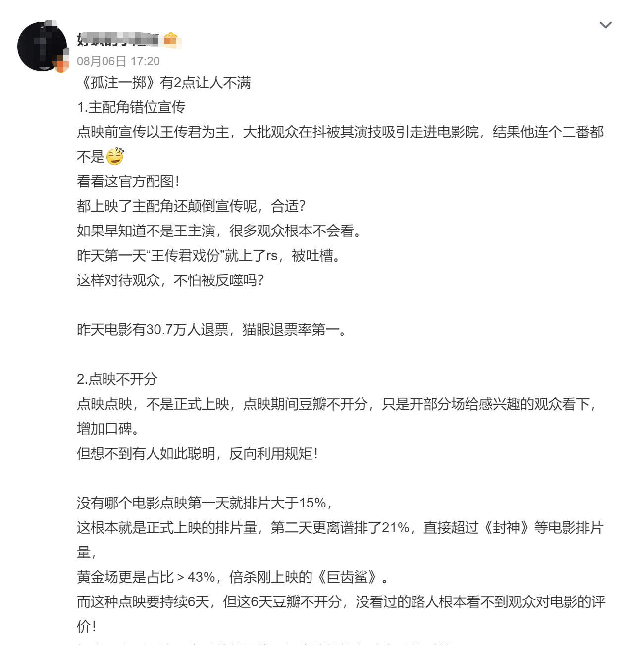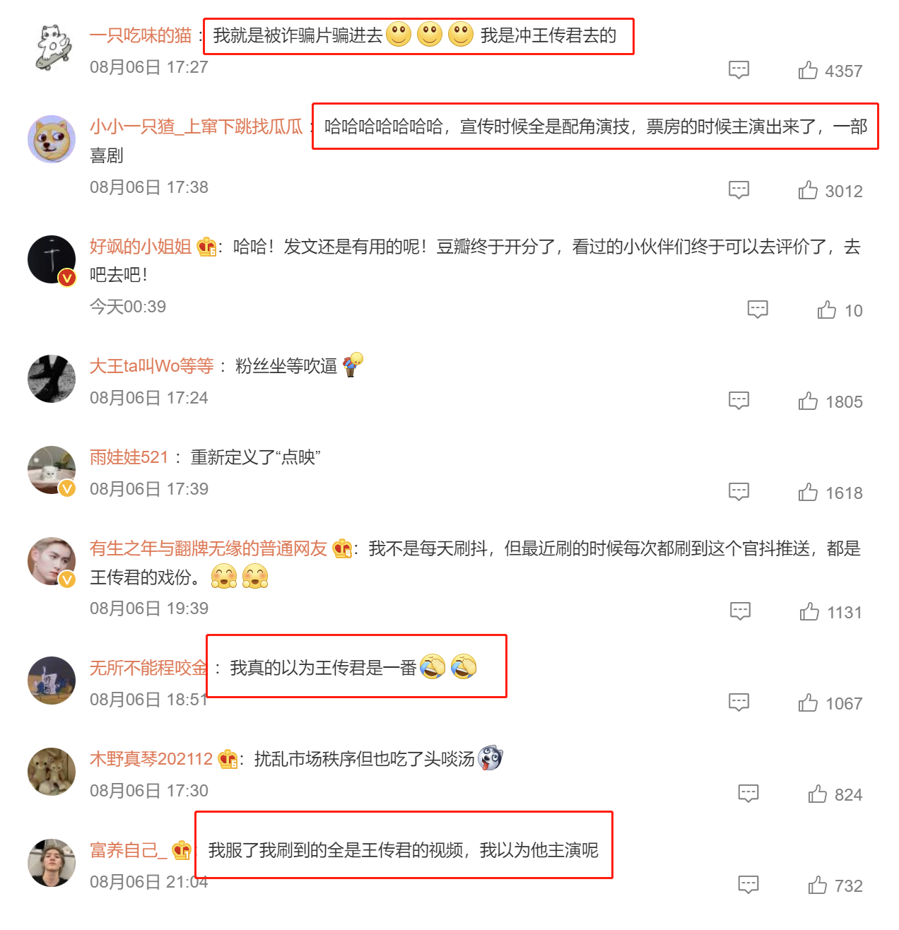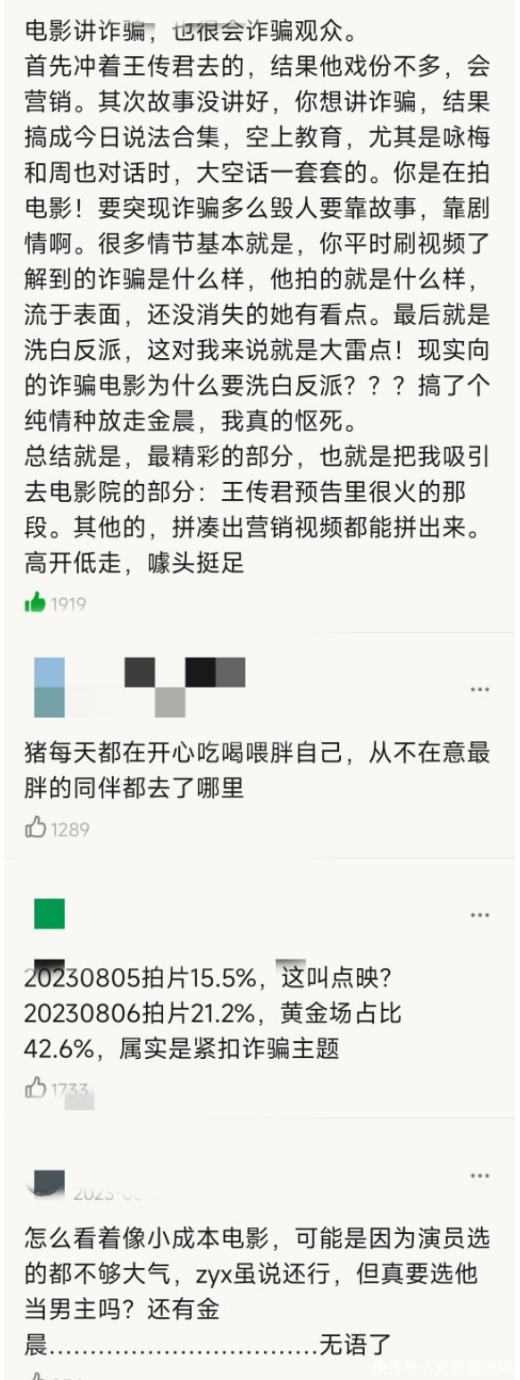 这条实质发布后,有网友指摘写到“我即是被应用片骗进去,我是冲王传君去看的。”另一位网友写的是“宣传技巧全是破碎演技,票房的技巧主上演来了,一部笑剧。”